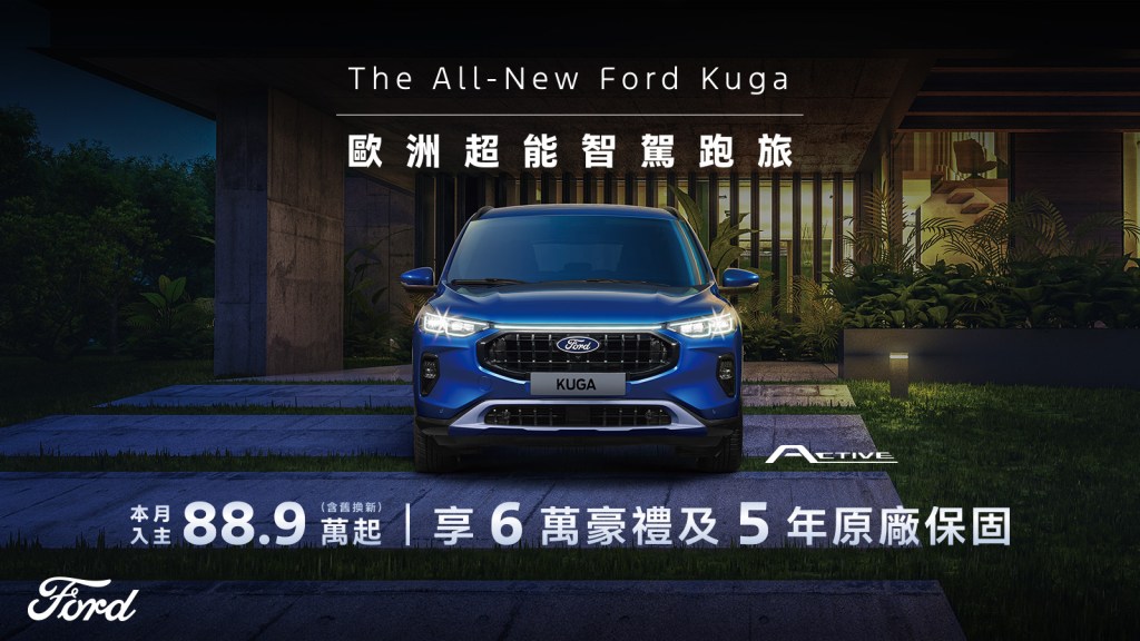 | The All-New Ford Kuga | 2025年2月28日至3月31日止 入主Kuga 1.5T Vignale、Kuga 1.5T Active享6萬豪禮:3萬元配件金、圖資升級(市值3萬)、5年原廠保固。 Kuga 1.5T Vignale建議售價:88.9萬起(含舊換新) Kuga 1.5T Active建議售價:96.9萬起(含舊換新) Kuga 2.0 AWD ST-Line建議售價:108.9萬(含舊換新) |