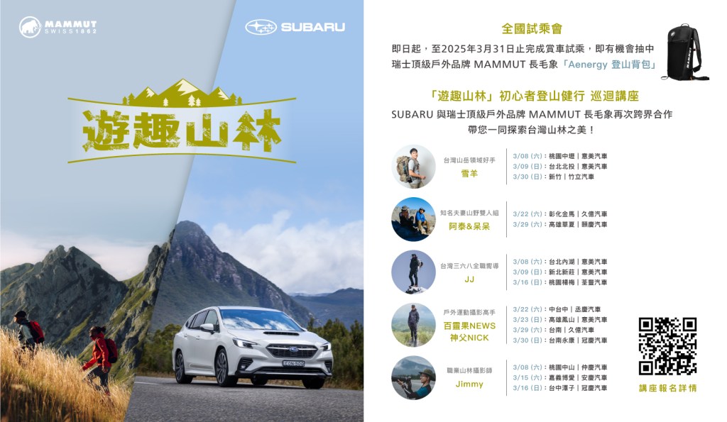 SUBARU車款具備極致安全與超凡越野能力,對於戶外玩家來說絕對是出行的最佳夥伴,讓SUBARU與生俱來的冒險基因,帶領車勇於冒險挑戰。而SUBARU對極致工藝的追求與瑞士頂級戶外品牌MAMMUT長毛象,以獨特技術、淬鍊製作堅持的理念十分契合,再度跨界合作,推出賞車試乘抽「MAMMUT長毛象精品登山背包」活動;更展開「SUBARU遊趣山林」全台巡迴主題講座,集結全國多位頂尖山岳達人現場分享台灣山林之美,歡迎嚮往戶外生活探險者報名參加。