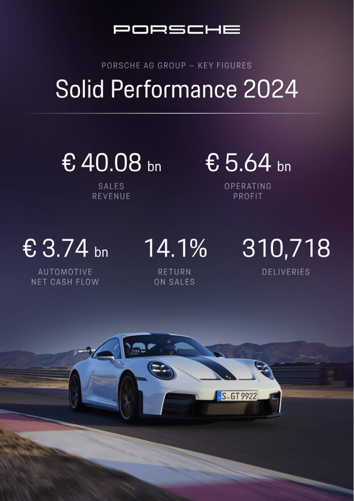 2024 財務年度的獲利表現,主要受到嚴峻的經濟環境以及產品陣容全面更新的影響。中國市場的緊縮情勢、全球電動車市場增長速度放緩,以及供應鏈體系的中斷,皆對營收與銷售報酬率造成影響。然而,保時捷管理團隊已透過多項積極措施,有效緩和這些負面因素帶來的衝擊。