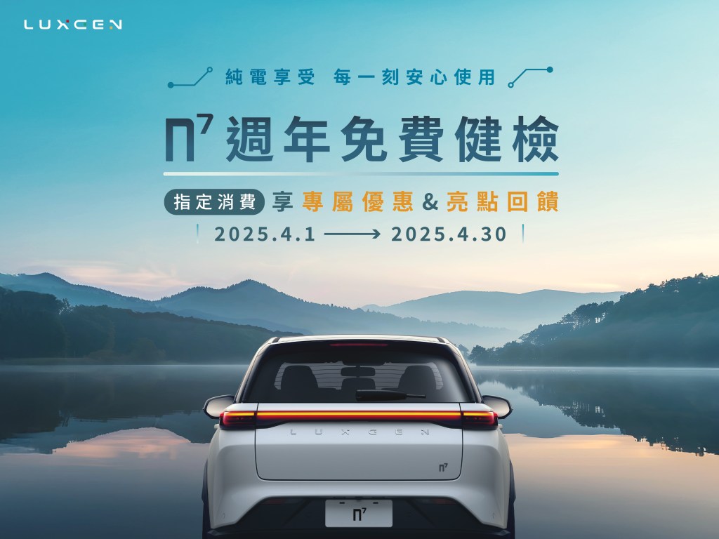 LUXGEN為提供車主安全無虞的用車生活,限時祭出「n⁷ 週年免費健檢」活動,免費提供「全車健檢」,包含:行車安全,動力、底盤、充電系統、車室內外等專業檢查;同步再享「n7專屬配件」限時優惠,其包含:貫穿式尾燈(原價 $20,000,優惠價 $13,000 / 含尾燈組與安裝費用)、前艙蓋氣壓撐桿套件(原價 $10,170,優惠價 $9,688 / 含套件與安裝費用,工法依現場服務人員說明為主)、LuxAero導流尾翼(原價 $9,360 ,優惠價 $8,800 / 含尾翼與安裝費用)等超值回饋;不僅如此,還有特別祭出「n7限定優惠」,包含:原廠級專業鈑噴最高85折優惠(不含零件)、鍍膜最高享9折等多項專屬禮遇,歡迎所有n7純電大使即刻預約回廠感受LUXGEN全方位的安全守護,讓每一趟旅程都能倍感安心。