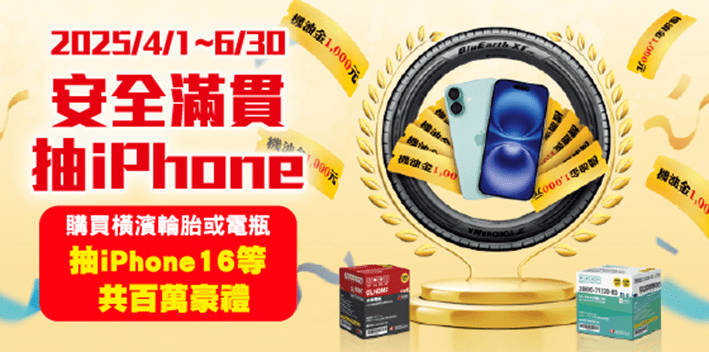 TOYOTA總代理和泰汽車關心車主的行車安全,特別推出「安全滿貫 抽iPhone」活動,凡於2025年4月1日至2025年6月30日期間,至全台TOYOTA服務廠或保修站購買橫濱輪胎或電瓶,即有機會抽中iPhone 16、行動電源、無線胎壓打氣機及千元機油金等共價值百萬元的多項好禮!