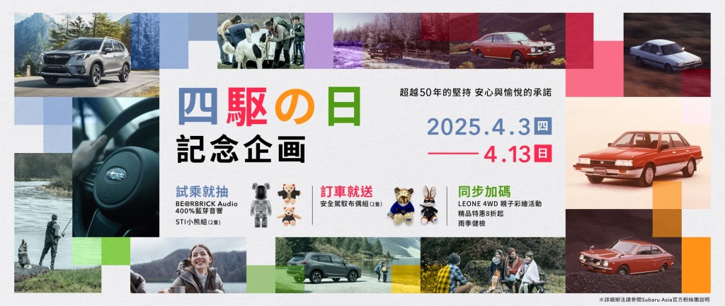 SUBARU總代理台灣意美汽車也特別推出「SUBARU 四驅の日 記念企劃」活動,凡於4月3日至4月13日的活動期間至全國各SUBARU據點賞車試乘CROSSTREK、FORESTER與OUTBACK任一款車型,不僅同行的孩童能夠獲得彩繪圖紙與色鉛筆等小禮物外,同時更有機會參與抽獎活動,幸運得主將有機會獲得BE@RBRICK AUDIO 400%藍牙音響與SUBARU STI小熊組(圍裙與冬季版)。於活動期間下訂SUBARU任一車款,更可於交車時獲得加碼贈送2025年最新款的品牌安全駕馭布偶組(功夫虎及忍者兔),活動內容請詳閱官方活動網站資訊(https://www.subaru.asia/tw/zh/promotions/events/620/AWD-day/)。
