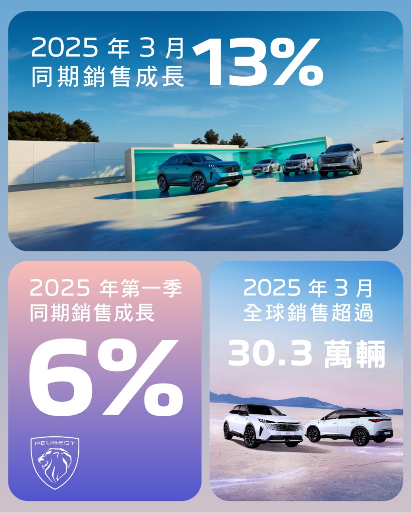 依據最新發布的公司財報顯示,截至2025年3月底,PEUGEOT今年首季全球銷量已突破30萬輛,較2024年同期提升6%。其中,3月單月更較去年同期成長逾 13%。