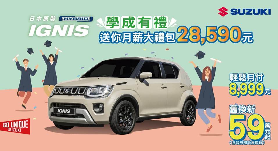 | IGNIS | 【學成有禮專案】 指定車款享「舊換新」NT$59萬元起領牌贈送月薪大禮包「購車金28,590元」58萬輕鬆貸,月付8,999元 | 即日-2025/04/30 |
