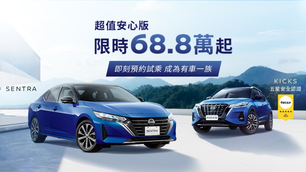 - 原建議售價73.5萬元的ALL NEW SENTRA尊爵版及76.5萬元的KICKS卓越版,係指NISSAN官網之建議售價扣除舊換新政府補助方案,即貨物稅條例換購新車退還減徵新車貨物稅5萬元,惟補助與否以政府最終審核為準。符合本專案優惠資格者,僅限114年05月01日起至114年05月30日止下訂指定車型「NISSAN ALL NEW SENTRA尊爵版、KICKS卓越版」並完成領牌程序之新車車主,享有專屬優惠價格68.8萬元 (含政府舊換新補助),售完為止。