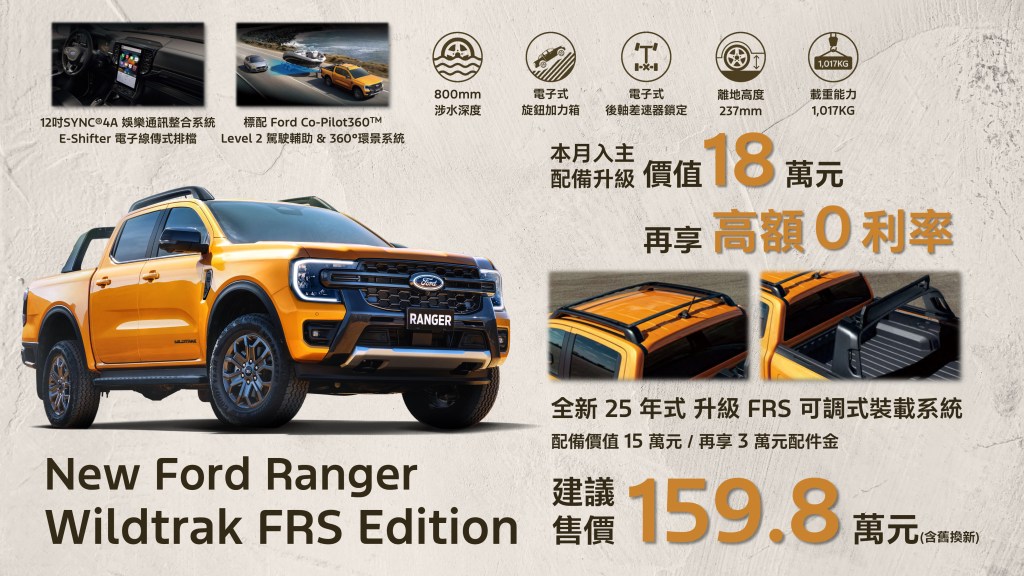 忠實承繼「Built Ford Tough」品牌精神,New Ford Ranger導入台灣以來,持續憑藉其完整的車用科技及安全防護配備、強悍的全地形征服能力以及多元的車型編成,成功在台灣市場樹立同級最佳的「皮卡風範」,其卓越實力不僅連續5年蟬聯「北美年度風雲皮卡」大獎,更在台灣市場繳出亮眼成績,奪下2024年進口運動皮卡級距銷售冠軍,2025年累計迄今亦穩居該級距銷售第一,顯見New Ford Ranger以其「硬悍」實力,已穩固建立自身地位。展望未來,Ford也將持續結合賽事經驗,拓展技術應用層級,進一步深化品牌皮卡車陣容的廣度與實力,並以多元且別具風格的產品特質,逐步實踐Ford總裁兼執行長Jim Farley要讓Ford成為全球Top.1越野品牌」的最終目標。福特六和正式導入New Ford Ranger全新25年式車型,提供智駕休旅運動皮卡Wildtrak FRS Edition及性能皮卡Raptor兩款車型,建議售價159.8萬元起(含舊換新)。其中New Ford Ranger Wildtrak FRS Edition 全新搭載FRS可調式裝載系統(配備價值15萬元),本月入主享3萬元配件金,提供總價值18萬元的配備升級幅度,另再享高額0利率優惠,快意入主台灣運動皮卡銷售冠軍,體驗更為便捷的戶外樂活新樂趣,福特六和敬邀消費者親臨全台展示中心,感受純正美式的粗獷越野精神。
