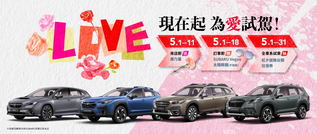 此外,凡於5月間前往全台SUBARU進行試乘體驗的顧客,皆有機會參加「虹夕諾雅谷關住宿券」(價值3萬元)的抽獎活動,虹夕諾雅度假村以”溫泉溪谷的樓閣”為概念,是一座與大自然相互共鳴的建築及景觀設計,客房都設有獨享的24小時的流動溫泉與半露天的溫泉池,再加上充滿日式風格的餐飲體驗,讓您有機會帶領全家人與母親一同體驗充滿日式元素的精緻住宿感受。