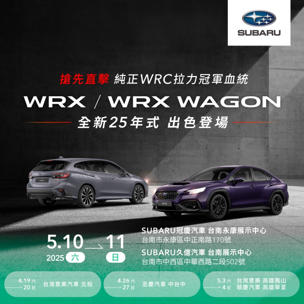 在正式上市之前,近期也將分別在意美鳳山(5月3、4日)、頤慶高雄(5月3、4日)、冠慶永康(5月10、11日)與久億台南(5月10、11日)等展示中心巡迴展出中,歡迎所有SUBARU的車迷朋友可以把握機會、先睹為快。