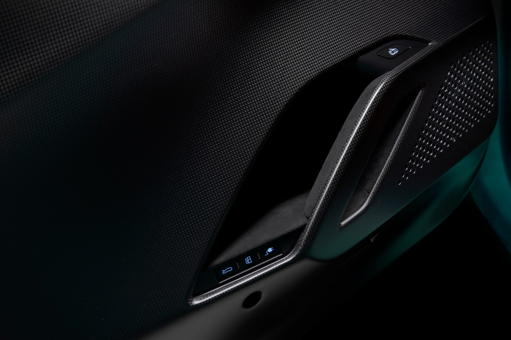 專為Ferrari 296 Speciale量身打造的車門飾板,採用一體式碳纖維結構,極致展現簡潔俐落的設計語彙。車門把手巧妙整合功能區域,微微隆起的造型自然延伸至簡潔流暢的型面,展現獨特美感。此外,為確保材質一致性,高傳真音響系統的揚聲器亦整合於此區域,低音單體透過碳纖維面板上精心排列的小孔傳遞聲音,兼具功能與視覺效果。