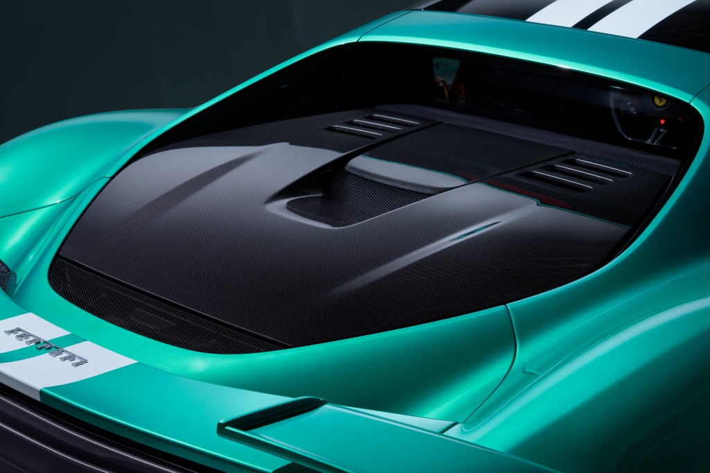 在引擎缸體與曲軸箱方面,新車沿用了曾在2023年與2024年利曼24小時耐力賽中奪冠的賽車Ferrari 499P的先進製程,缸體與曲軸箱經過精密加工,削減多餘金屬,相較於以往版本成功減重1.2公斤。此外,引擎缸體與氣缸蓋採用鈦合金螺絲與螺栓,進一步減重1.9公斤。值得一提的是,這類技術過去僅應用於賽車引擎,如今首次引進公路跑車之中。