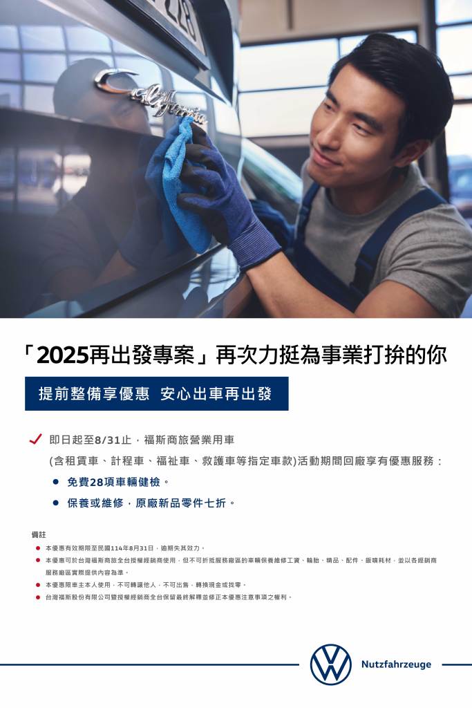 於台灣觀光旅遊市場逐步回溫之際,穩坐台灣商用車龍頭的福斯商旅,針對營業用車提供專屬優惠,在拚國旅、拚經濟的同時,也關心頭家的生財工具及行車安全。即日起推出福斯商旅品牌營業用車專屬的「2025再出發專案」,自即日起至今年8月 31 日止,凡指定車款回全台福斯商旅授權服務廠,即可享:
