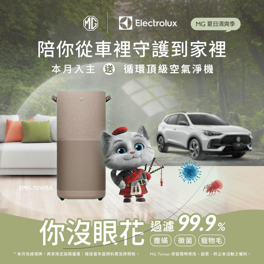 更值得一提的是,除了於六月購買HS、ZS車型獲得上述優惠外,MG Taiwan還提供高額低首付優惠貸款方案、高額配件金,以及贈送Electrolux伊萊克斯雙效涼風循環空氣清淨機(市價22,900元)等多重購車選擇,讓車主們得以根據個人需求靈活搭配,坐擁MG史上最強限時購車優惠方案。