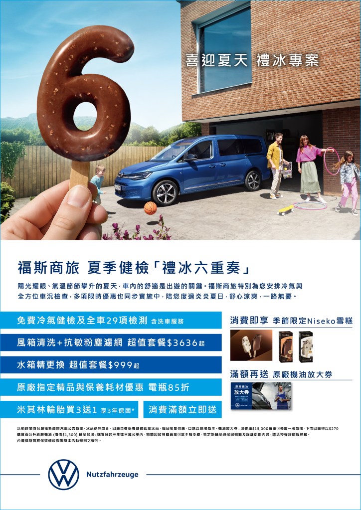 夏季溫度逐漸飆升,您的愛車準備好迎戰酷暑了嗎?每年夏天,高溫總是愛車的一大考驗——冷氣不夠冷、引擎容易過熱、輪胎磨損加劇。福斯商旅深知車主的熱夏困擾,即日起推出「禮冰六重奏」夏季健檢專案,讓專業售服體系為您的愛車做好萬全準備。這個夏天,只管享受路上風景,其他的交給福斯商旅!福斯商旅更攜手人氣冰品品牌 Niseko新雪口,讓日系療癒雪糕為您與愛車一同迎來沁涼好心情。