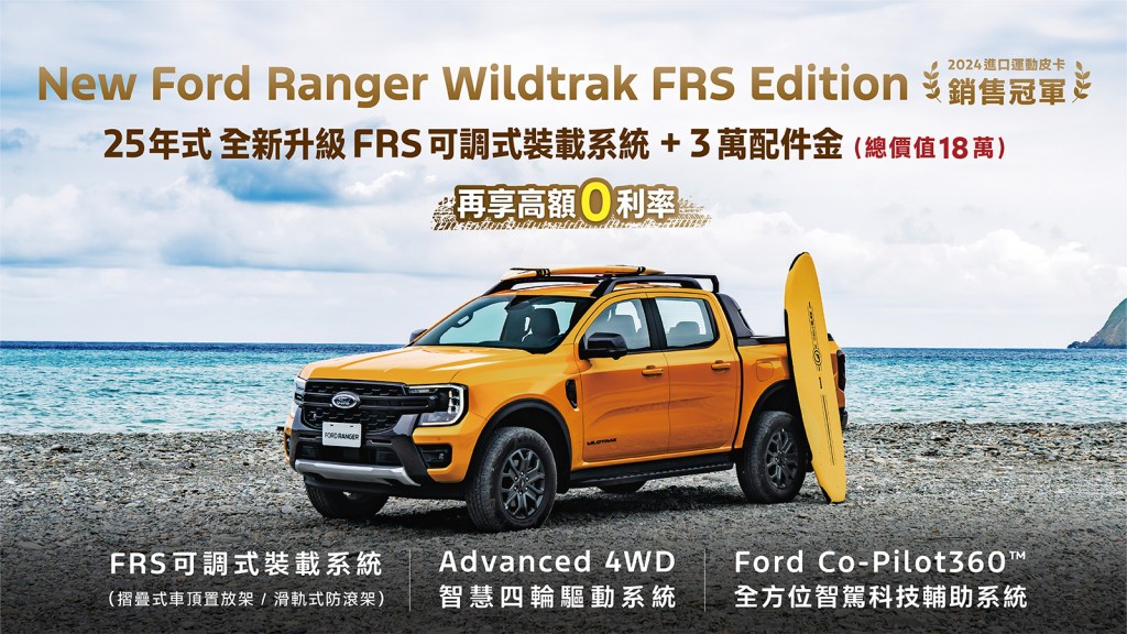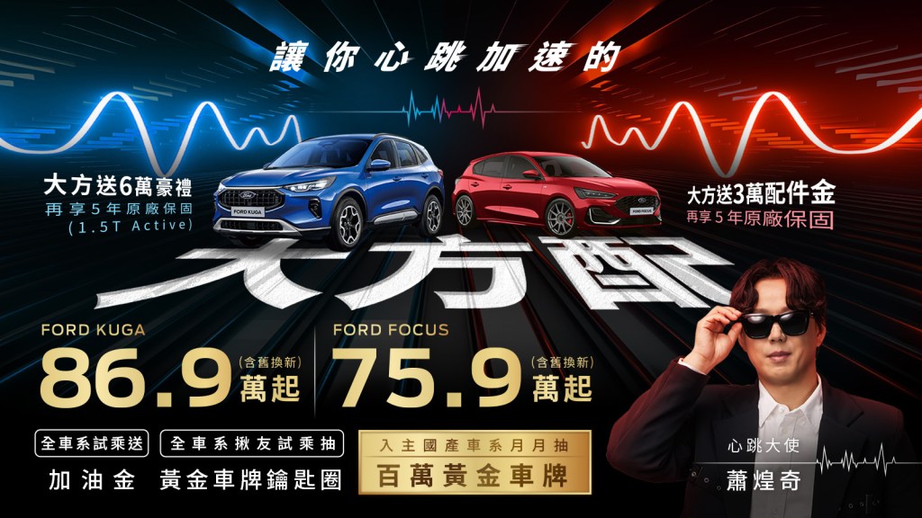 福特六和攜手榮獲四座金曲獎「最佳台語男歌手」的心跳大使蕭煌奇,推出「大方配」購車優惠方案,2025年5月30日起至2025年6月30日止,凡至全台Ford展示中心試駕全車系,即可獲得加油金,揪好友試駕再抽黃金車牌鑰匙圈,入主國產車系再加碼月月抽百萬黃金車牌!全車系優惠包含The All-New Ford Kuga舊換新享86.9萬元起,指定車型再享大方送6萬豪禮及5年不限里程原廠保固;全新年式New Ford Focus 75.9萬起(含舊換新)重磅升級,領先同級搭載FAPA主動式停車輔助系統2.0,全車系大方送3萬元配件金,再享5年不限里程原廠保固;德製性能鋼砲New Ford Focus ST 25年式,先馳德點享148.9萬元起;New Ford Tourneo Connect福特旅玩家享高額0利率,再加碼5年不限里程原廠保固;New Ford Ranger全新25年式車型Wildtrak FRS Edition,升級FRS可調式裝載系統,並享3萬元配件金,提供總價值18萬元的配備升級幅度,再享高額0利率優惠。盛夏超值購車優惠限時開跑中,敬請把握機會輕鬆入主Ford好車,讓Ford陪您暢享夏日駕馭樂趣。