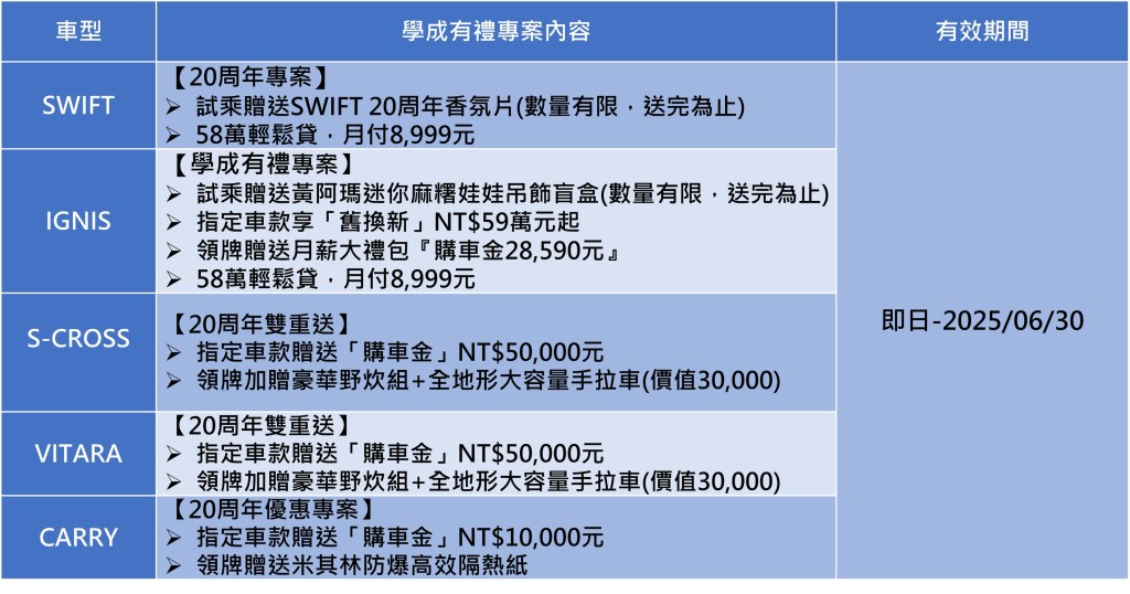 - TAIWAN SUZUKI保留變更活動內容及最終解釋之權利,詳情請洽各大經銷商及官網