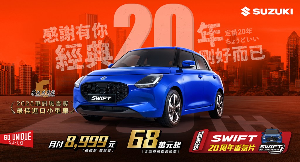 為了感謝台灣消費者20年來的支持與喜愛,TAIWAN SUZUKI特別推出「20周年專案」,讓您以輕鬆月付8,999元的超值優惠,輕鬆入主暢銷神車SWIFT,無壓力享受高效節能的駕馭樂趣。此外,現在來店試乘SWIFT,即可獲得SWIFT 20周年獨家香氛片,為您的旅程增添獨特品味,感受專屬於SWIFT的非凡魅力!