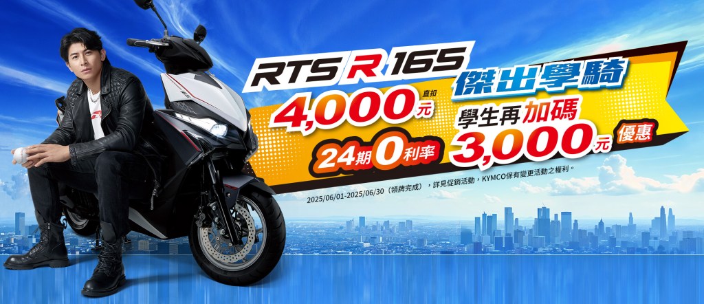 隨著大學放榜結果出爐,許多年輕學子即將展開全新的人生篇章,KYMCO 也特別針對學生族群推出「RTS R165傑出學騎」限時購車活動,與 Team RTS 隊長陳傑憲一同見證大學新鮮人的「人生第一台車」。KYMCO 希望透過此優惠活動,鼓勵每位新鮮人都能像隊長及 RTS R 所代表的精神—以勇於追求極限、征服未來的熱血精神,迎接未來的嶄新生活。即日起,入手 KYMCO RTS R 165 即享學生專屬購車優惠,讓 KYMCO 新世代水冷超級街跑 RTS R 165 陪你過暑假,有興趣的同學絕不能錯過!