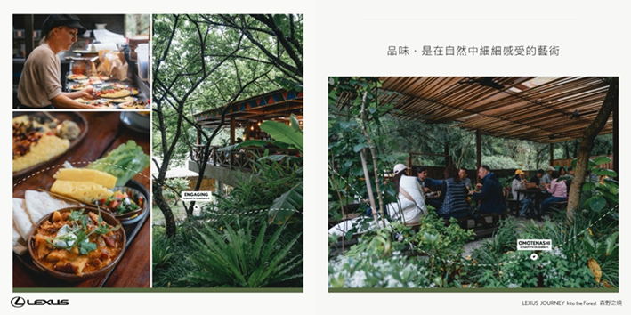中午造訪隱身山林、需事先預約的秘境人氣餐廳Hana廚房,享用結合南非與鄒族文化的無菜單料理。這座餐廳由來自南非的老闆娘與鄒族丈夫共同經營,將愛情故事與家鄉熱情融入每一道菜,透過部落小農的純淨食材、異國香料與傳統烹調技法,呈現獨特的跨文化風味。當天老闆娘更為Lexus貴賓特製餐點,就連嘉義在地車主也讚嘆品牌眼光獨到,能夠找到這座低調卻知名的隱密餐廳並成功包場,展現對品味的高度講究。