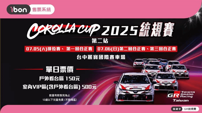 為讓更多車迷親臨現場參與,6月9日中午12:00起,民眾可至全台7-ELEVEN門市之ibon機台,或上ibon網站(https://ibontw.com/2025tgrcorollacup)購買入場門票;票價分為戶外看台區(新台幣150元)及室內VIP區(含戶外看台區;新台幣500元),座位有限,售完為止。