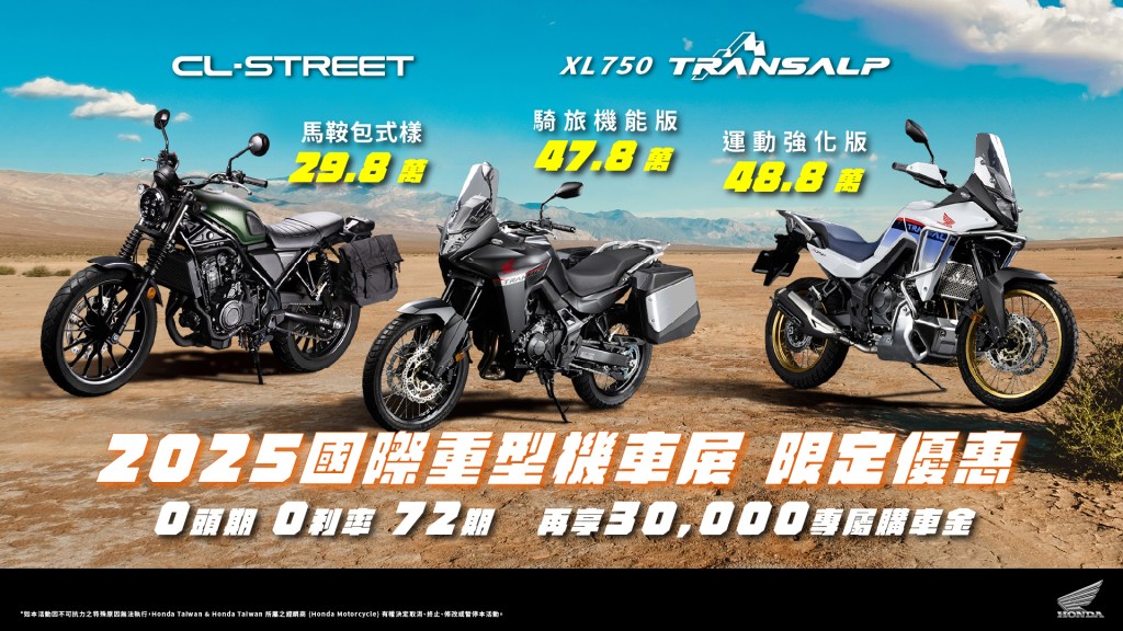 廣受好評的冒險車款XL750,運動強化版(含水箱防護網、前防護桿、支架、引擎防護桿、引擎下護板、護弓支架、快速換檔套件 價值:60,202) 運動化的外觀與配備,熱血風格全面進化,售價:488,000 ; 騎旅機能版(含專屬側箱組、專用支架、鋁合金面板 價值:45,860)以及都會潮流車款CL Street:29.8萬加贈馬鞍包(價值9,370),兩款車款除享72期,零頭款、零利率之外,再送三萬元購車金,讓您在探索未知或是享受城市騎乘時,都能擁有更多獨一無二的騎乘體驗。