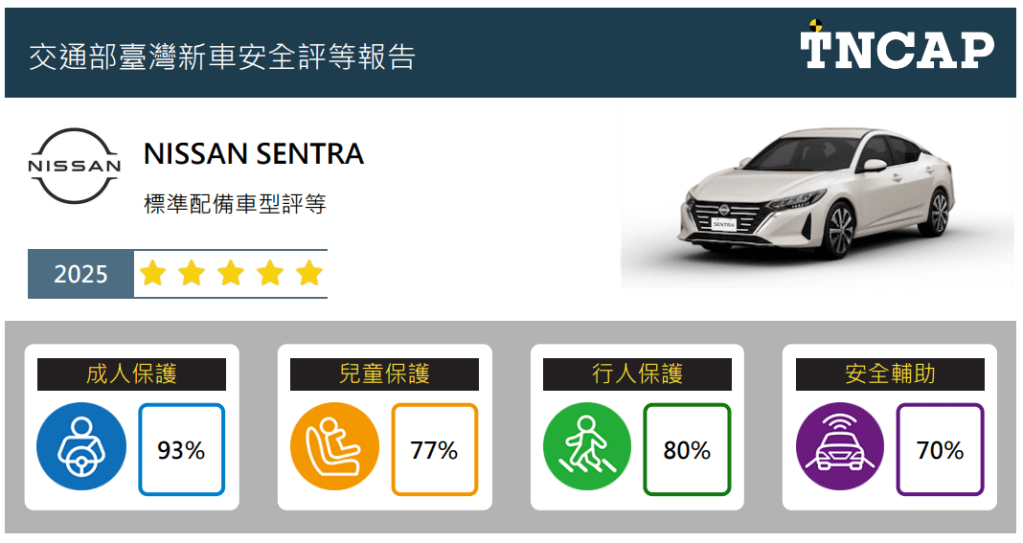 - NISSAN SENTRA於四大安全領域得分率中分別獲得成人保護93%、兒童保護77%、行人保護80%及安全輔助70%,依據星級評等平衡標準規定,SENTRA車型整體星級評等為五顆星。