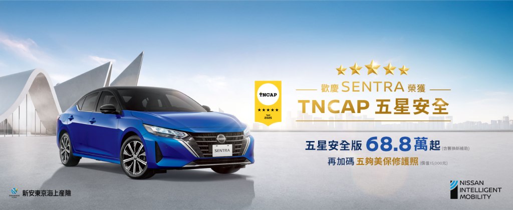 註1:本新聞稿所示之金額均以新台幣計價。NISSAN SENTRA榮獲TNCAP 五星安全認證請參閱TNCAP官網:https://www.tncap.org.tw/SafetyRatings/Detail/bc08bf8a-cac1-49dd-b485-b56eecd17014