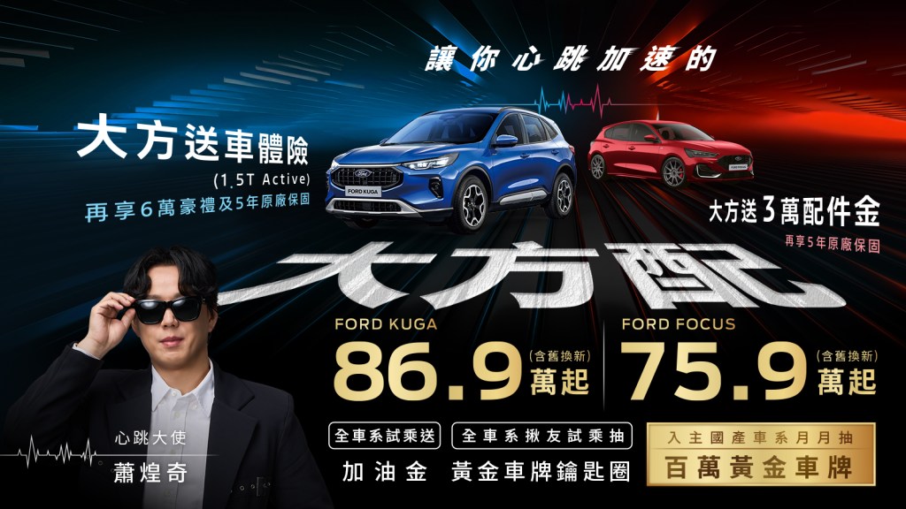 七月熱浪席捲全台,車市亦展現蓄勢待發的購車動能!Ford力推心動「大方配」購車方案!自2025年7月1日起至7月31日止,凡至全台Ford展示中心試駕全車系,即贈加油金,揪好友試乘,再抽黃金車牌鑰匙圈;凡入主國產車系,更有機會月月抽中百萬黃金車牌大獎。此外,Ford本月亦加碼The All-New Ford Kuga優惠方案,全車系舊換新享86.9萬元起[1],1.5T車型不僅獨享大方送6萬元豪禮,入主1.5T Active車型再加碼丙式車體險及5年不限里程原廠保固[2],優惠總價值近9萬元,積極搶攻車市旺季。此外,New Ford Focus全新年式亦同步升級,舊換新享75.9萬元起,全車系大方送3萬元配件金,再享5年不限里程原廠保固[3];New Ford Ranger全新25年式Wildtrak FRS Edition則提供百萬0利率購車優惠及5年不限里程原廠保固,再加贈1萬元購車金及3萬元配件金;New Ford Tourneo Connect福特旅玩家全新25年式亦提供高額0利率購車優惠及5年不限里程原廠保固。Ford盛夏購車優惠現正火熱登場,敬請把握良機輕鬆入主,與Ford一同開啟熱情奔放的夏日駕馭旅程!