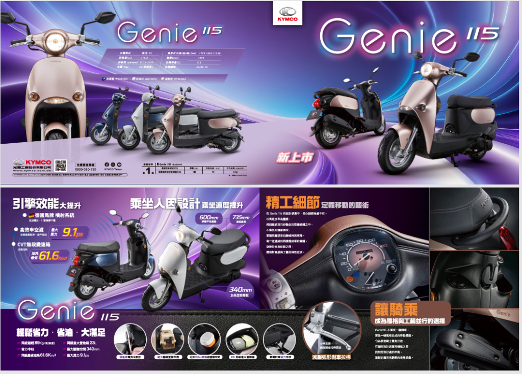 柯俊斌董事長表示:「Genie 小精靈用獨特行銷手法包裝,首創國內機車界 AI 廣告跟以及IP角色超萌吉祥物「Genie 潮萌小精靈」,不僅成為廣告亮點、人見人愛,更代表 KYMCO 邁入年輕風格化、數位化的新世代行列。」「Genie 小精靈」的可愛設計一登場便引起全場熱議,尤其在重車展「大車」的包圍下,嬌小輕巧的潮萌 Genie 115 更顯得突出亮眼又特別。