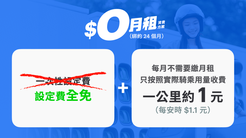 | 收費方式 | 不須繳交月租費,僅於方案開通時收取一次性設定費。每月依照實際騎乘里程收費,騎多少付多少,每安時 $1.1 元(相當於每公里約 $1 元) | |