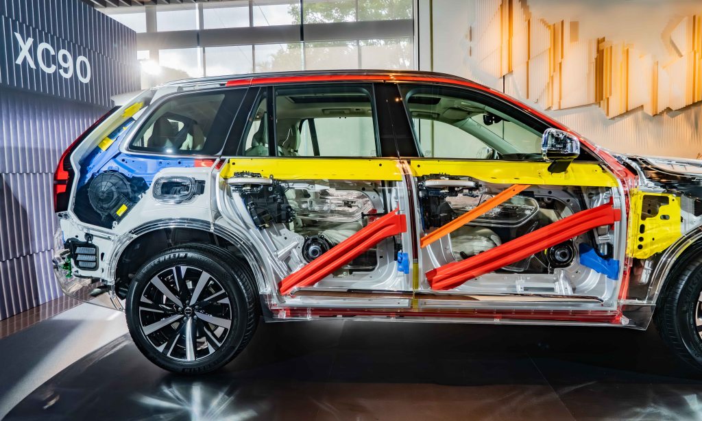 - The New XC90 透明結構概念車能一目瞭然其六條縱向骨架(A 柱、B 柱與 C 柱)與六條橫向鋼樑交織成 3D 立體棋盤結構,打造出堅若磐石的籠型車體設計,以宛如堅不可摧的「七人座安全座艙」而帶來出色的被動安全防護能力。
