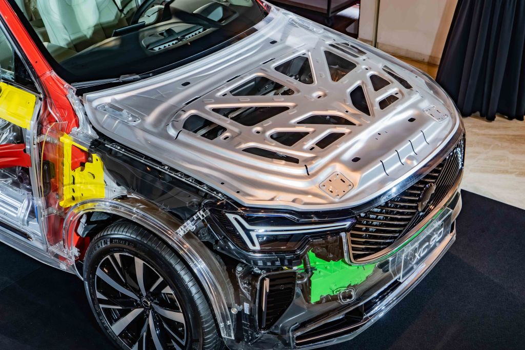 而在意外常發生的車頭部分,The New XC90 以不同等級的鋼材設計出具有彈性的潰縮區,在事故發生時,透過鋼材不同帶來預設的形變與能量傳遞,有效吸收並分散撞擊能量達到保護乘客安全。引擎室內體積精巧的動力系統亦透過縝密規劃,在撞擊發生時能配合潰縮結構同步移動,搭配可潰縮方向機柱設計及位於儀錶板下方的高強度合金護桿,進一步確保對駕駛室的保護效果。此外,獨特的車頭幾何構造及隱藏在車門外框架中與車體內的縱向、橫向熱成型棚鋼樑支撐,可進一步將撞擊能量從車頭循序傳遞至車體各部位,進行撞擊能量的傳導與分散,降低乘客艙所承受的能量與形變,多項創新設計為求維持車室形狀完整,讓車艙中的三排乘員都能獲得妥善防護。