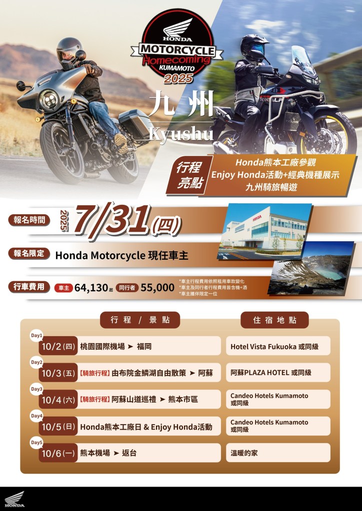 Honda Taiwan秉持著「The Power of Dreams – How we move you.」的品牌精神,以夢想為原動力,創造各式各樣的移動便利性,為台灣顧客打造「兼顧樂趣以及安全的重機騎乘環境」,為了感謝所有 Honda Motorcycle 車主的支持,將於10月舉辦2025 Honda Motorcycle Homecoming 九州騎旅之旅活動,除了廣受好評的Honda熊本製作所參訪與九州地區的重機騎乘體驗外,今年更加碼安排參與Honda年度盛事「Enjoy Honda 2025 HSR九州」活動,讓車主們能全方位感受Honda的品牌精神與熱血魅力。