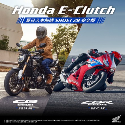 引領科技潮流,搭載劃時代E-Clutch的 CB650R E-Clutch 與 CBR650R E-Clutch,提供更純粹、更俐落的換檔感受,入主再送Shoei Z-8安全帽,除了擁有頂級安全的防護讓每一趟的騎乘都更加安心自在,更完美融合騎乘樂趣與風格兼具的魅力。