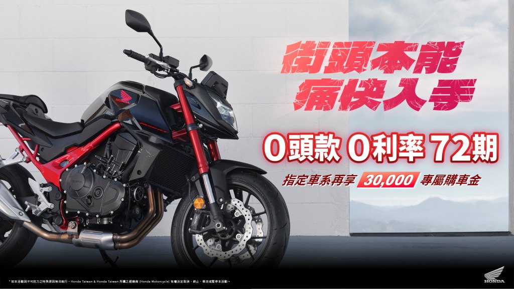 Honda Taiwan秉持「The Power of Dreams – How we move you.」的品牌精神,致力於提供卓越的產品與服務,豐富的產品線讓各式風格的騎士皆能享受騎乘的樂趣,為回饋廣大顧客的支持,於八月針對多款人氣機種推出「街頭本能 痛快入手」優惠專案,不僅享有72期零頭款、零利率,特定車款更享三萬元購車金,提供喜愛二輪生活的顧客更輕鬆入主心儀的Honda二輪車款。