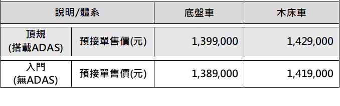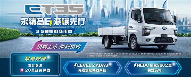 《貨物稅條例》修正條文正式公告,汰舊換新補助於7日正式實施,即日起2,000cc以下新車可享5萬元貨物稅減徵,汰換十年以上老車再獲5萬元優惠,趕在貨物稅補助上路第一時間,中華三菱響應政策,除推出各車型優惠活動,更同步宣布,國內首款 3.5 噸純電商用車 ET35 正式開放預接,純電木床車售價141.9萬起。ET35為台灣首台量產的3.5噸電動商用車,並領先3.5噸車型同級車款,搭載LEVEL 2 ADAS先進駕駛輔助系統,提升行駛安全。為滿足客戶的使用需求,ET35提供木床與底盤車型,且分別加價一萬元,即可升級為ADAS車型,強化動力與安全,滿足企業在安全性、智慧化及低碳運輸上的全方位需求。