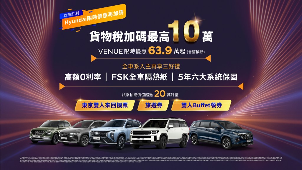 HYUNDAI汽車九月限時購車案自1日起於全台展示中心實施,受2,000 c.c.以下新購小客車貨物稅加碼註1帶動,展間買氣回升,來店賞車人次較上月成長10%。HYUNDAI VENUE、MUFASA、CUSTIN、SANTA FE均屬政策適用範圍;若同時辦理符合要件之汰舊換新,合計最高可減負10萬元。全車系同步加碼「三好禮」:高額零利率、FSK全車藍鑽隔熱紙、5年六大系統不限里程延長保固,讓消費者把握九月黃金入主檔期。
