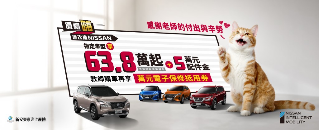 註2:教師人員「萬元電子保修抵用券」禮遇優惠活動適用對象為:於2025年9月份持教師證明文件(教師證書或學校教師聘書)下訂指定車型並完成領牌程序之新車車主。教師證明文件之機構包含學前教保服務機構(幼兒園、互助教保服務中心)、國民中、小學、高級中等學校、大專院校、宗教研修學校、空大及大專附設進修學校、特殊教育學校、軍警大專校院、大陸臺商子弟學校與海外臺灣學校。領牌車主須為教師證明文件本人,補教業者及學校行政人員不適用此方案。電子保修抵用券於2025年10月30日前統一匯入車主或駕駛人名下車輛綁定之NISSAN CARE APP,供後續保修費用抵用。萬元電子保修抵用券面額為「壹千元10張」,每次最多使用5張(面額5,000元),於車輛自費定保或維修時使用,但不限定實作項目。電子保修抵用券金額恕不找零,亦不得要求折現或退費,有效期限為自領牌日起算兩年內,限於本島之原廠服務廠使用完畢,逾期將自動失效無法抵用。