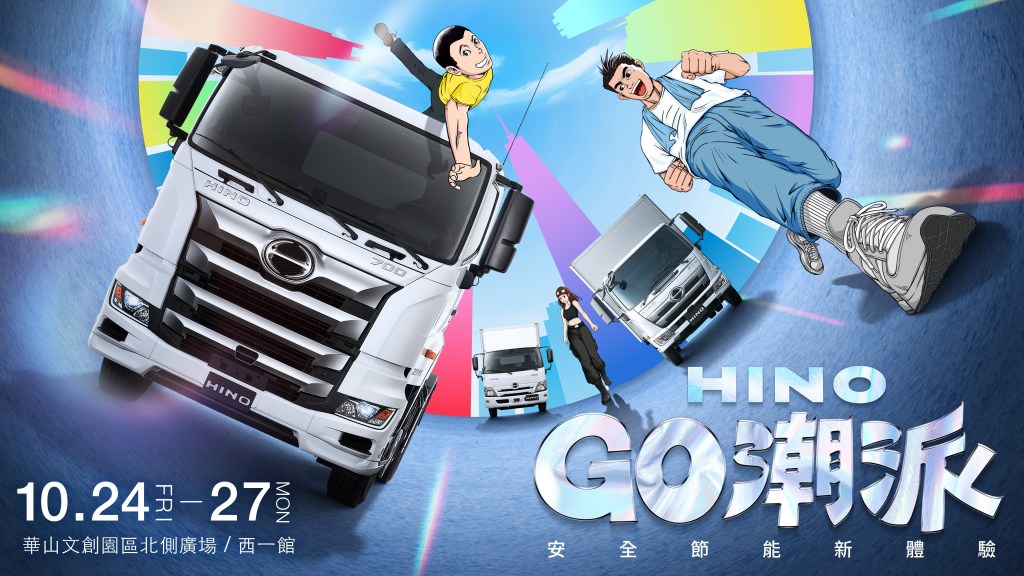 HINO身為商用車市場領導品牌,致力提供更安全、智能的車款與駕駛體驗,陪伴各行各業頭家車主一起打拚運轉台灣。為提升大眾對商用車的認識,擴大傳遞行車安全正確觀念,今年特別舉辦「HINO GO潮派-安全節能新體驗」活動,10/24(五)~10/27(一)於台北華山文創園區西一館盛大登場,打造融合「行車安全x節能環保x大車文化」兼具教育與趣味的大車嘉年華,活動亮點包含「戶外展車安全展演-大車視野盲區、省油安駕挑戰賽」及「室內日野大道沉浸式特展」,現場邀請人氣潮流卡司:阿跨面、韓籍啦啦隊(南珉貞、趙娟週、朴旻曙)、AKB48 TP、山姆、Ozone、原夢代表隊合唱團接力開場,亦準備豐富潮流好禮,邀請HINO車主及所有民眾共同參與,一起感受潮好玩的大車文化魅力。