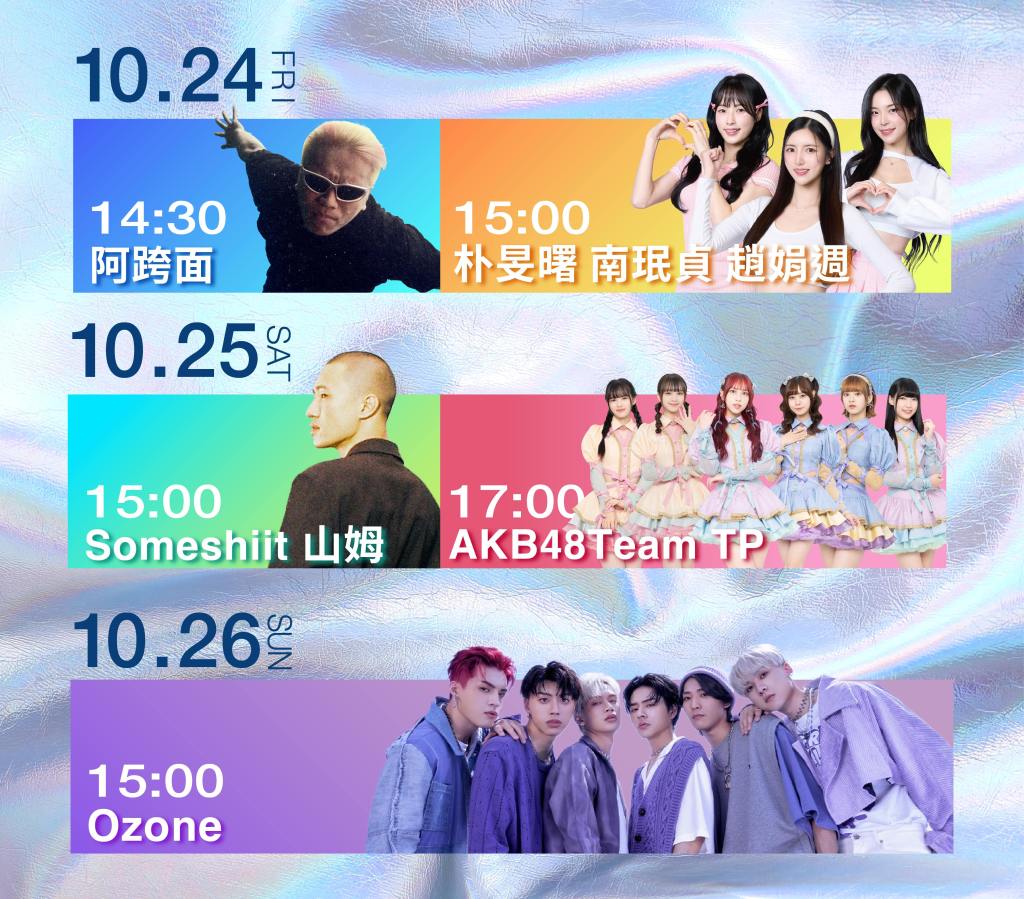 活動期間每日邀請重量級藝人及人氣女團輪番上陣,帶來潮流音樂與舞台互動演出。10/24(五)開幕日邀請嘻哈歌手-阿跨面與韓籍啦啦隊-南珉貞、趙娟週、朴旻曙熱情應援,10/25(六)由金曲最佳新人-山姆及活力偶像女團-AKB48 Team TP 接力演出,10/26(日)則有新生代超人氣男團-Ozone熱力登場,10/27(一)則由原夢代表隊-新竹桃山國小合唱團帶來別具意義的泰雅天籟合唱表演,活動四日潮流舞台音浪不間斷,給您熱力滿載的大車能量!