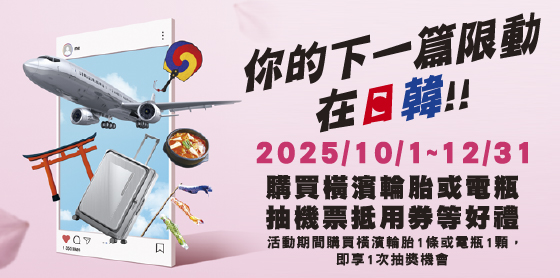 2025 年 10 月 1 日(三)至 12 月 31 日(三),至全台 TOYOTA 服務廠或保修站購買橫濱輪胎或電瓶,即可獲得抽獎機會,把「日韓機票抵用券、Samsonite 行李箱與 1,000 元機油金」帶回家!