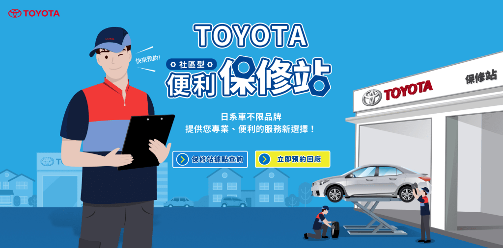 TOYOTA保修站全台已超過100間,結合服務廠,服務據點總數已逾220間。專業服務團隊持續提提供定期保養、輪胎及電瓶檢測與更換服務。