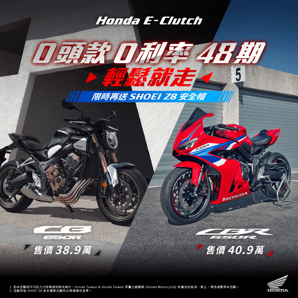 訂購CB650R E-Clutch、CBR650R E-Clutch享0頭款 48期 0利率完成領牌限時贈送Shoei Z-8安全帽