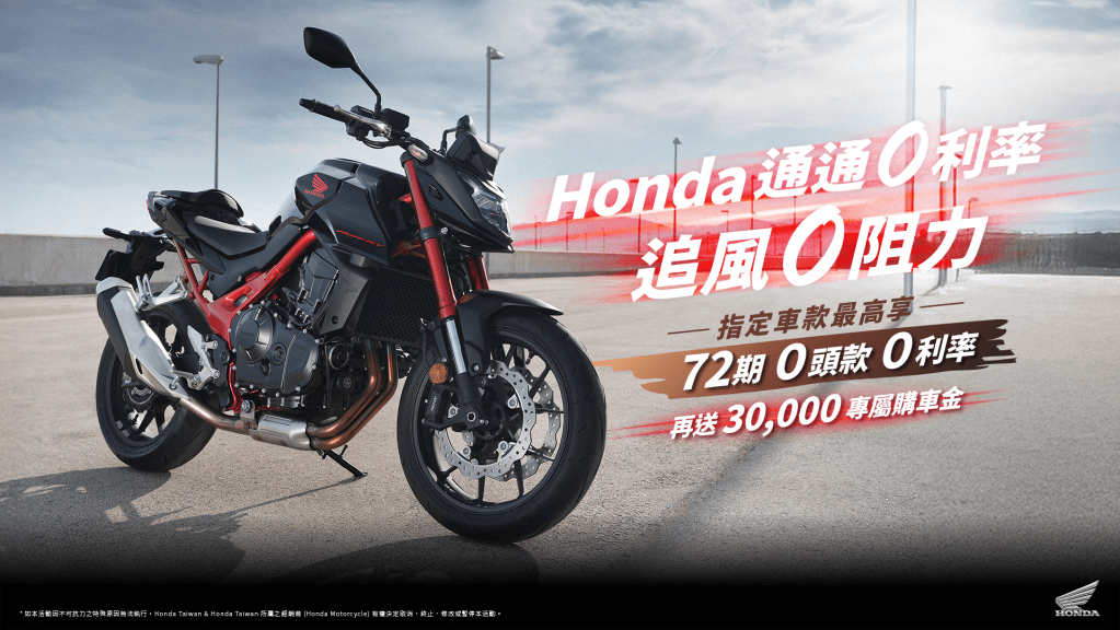 Honda Taiwan 秉持 「The Power of Dreams – How we move you.」 的品牌精神,致力於提供卓越的產品與服務,讓每一位騎士都能在多樣化的產品線中,找到專屬於自己的騎乘樂趣,於11月推出多項購車優惠專案,無論是帥氣有型STREET車系到壯闊冒險的ADVENTURE車系,指定車款,皆可享48期的零利率優惠,以最輕鬆的方式,即刻跨上心儀的Honda夢想車款,享受暢快的騎乘樂趣。同時針對搭載全新科技的CB650R E-Clutch、CBR650R E-Clutch以及經典美式巡航Rebel車系,更推出限時加碼好禮。