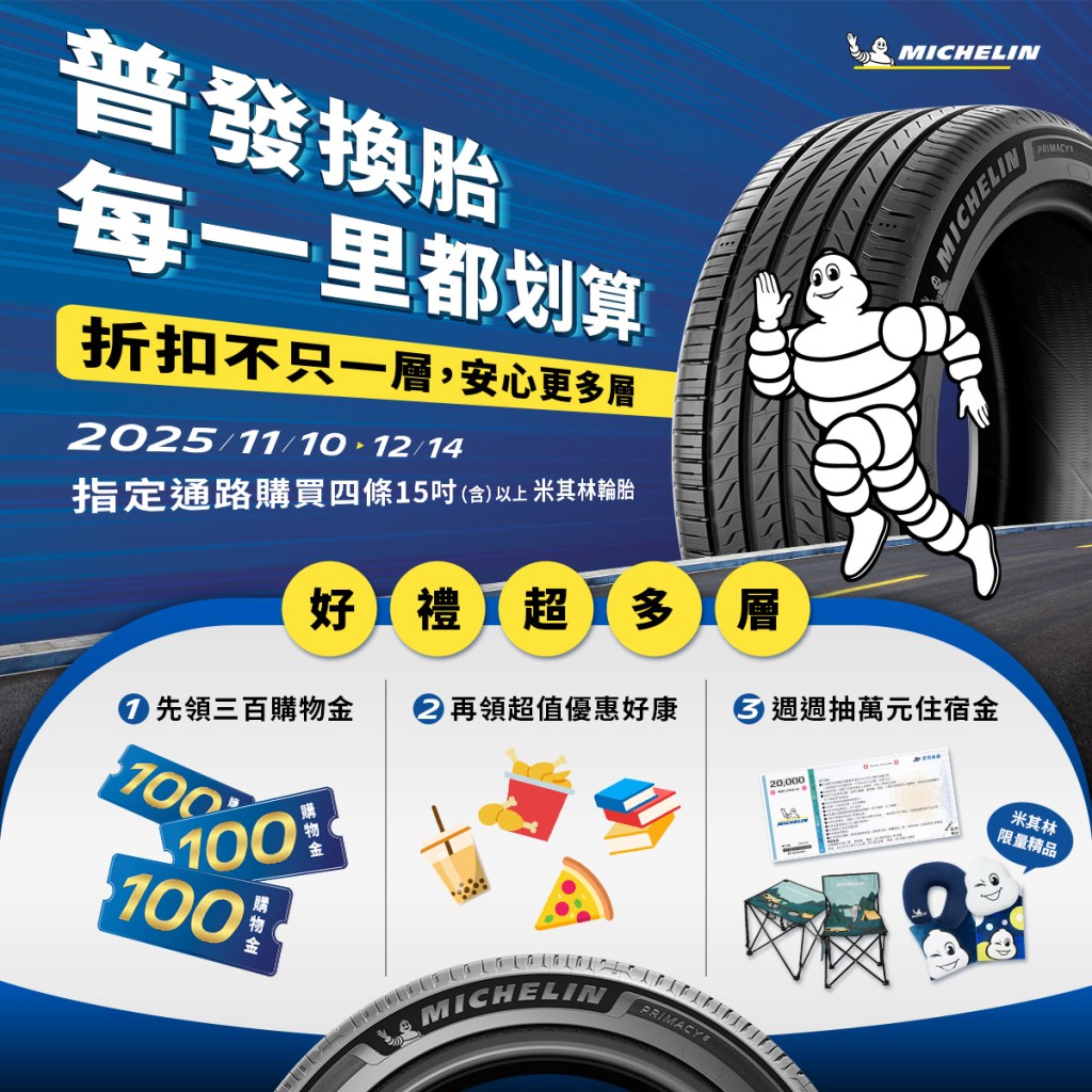 為了讓普發紅包花得更有感,台灣米其林推出多重加碼優惠。自 2025 年 11 月 10 日至 12 月 14 日止,凡於全台馳加與米其林輪胎中心購買四條 15 吋(含)以上米其林輪胎,並完成 LINE 官方帳號登錄,即可獲得「生活享樂金」組合。內容包含現領 $300 電子商品禮券,加碼多重通路的超值優惠好康,無論是日常補給、居家選品或輕鬆享食,都能讓這筆紅包用得聰明又有感,享受生活每一刻的美好。活動期間也同步加碼週週抽,送出萬元住宿金兌換券與米其林限量精品等好禮,真正做到折扣不只一層、安心更多層。