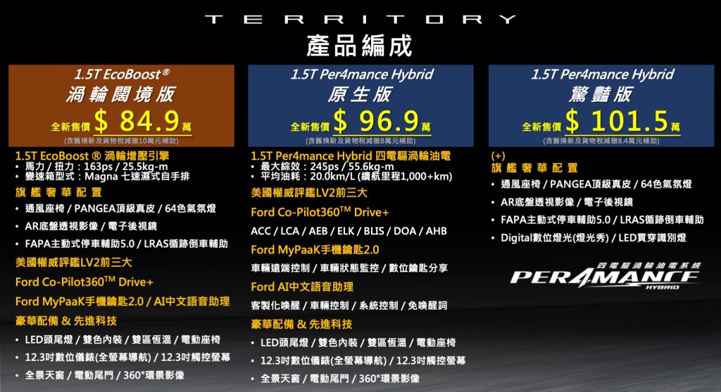 由於中國車身分的高度敏感性,再加上政府訂出35%的自製率規範,使得源自中國江鈴福特旗下領睿(Equator Sport)幾經波折後,終於在日前由福特六和正式導入國產化,並以Territory之名提供1.5T Per4mance Hybrid四電驅渦輪油電及1.5T汽油渦輪兩種動力以及三種等級車型,正式售價94.9萬起(扣除舊換新及貨物稅減徵補助為84.9萬),也就是說Territory已經不再具備歐洲或美國的血統。同時為了刺激買氣,福特六和針對Territory打出2025年底前入主享價值超過8萬的四大早鳥好禮,包含5年原廠保固〔註一〕、3年內建導航圖資更新、3年MyPaaK手機鑰匙2.0服務,以及專屬行李艙旗艦套件。Territory於12月13日起全國全面展開試駕體驗,敬邀消費者即刻預約試駕,刷新每一次驚豔!