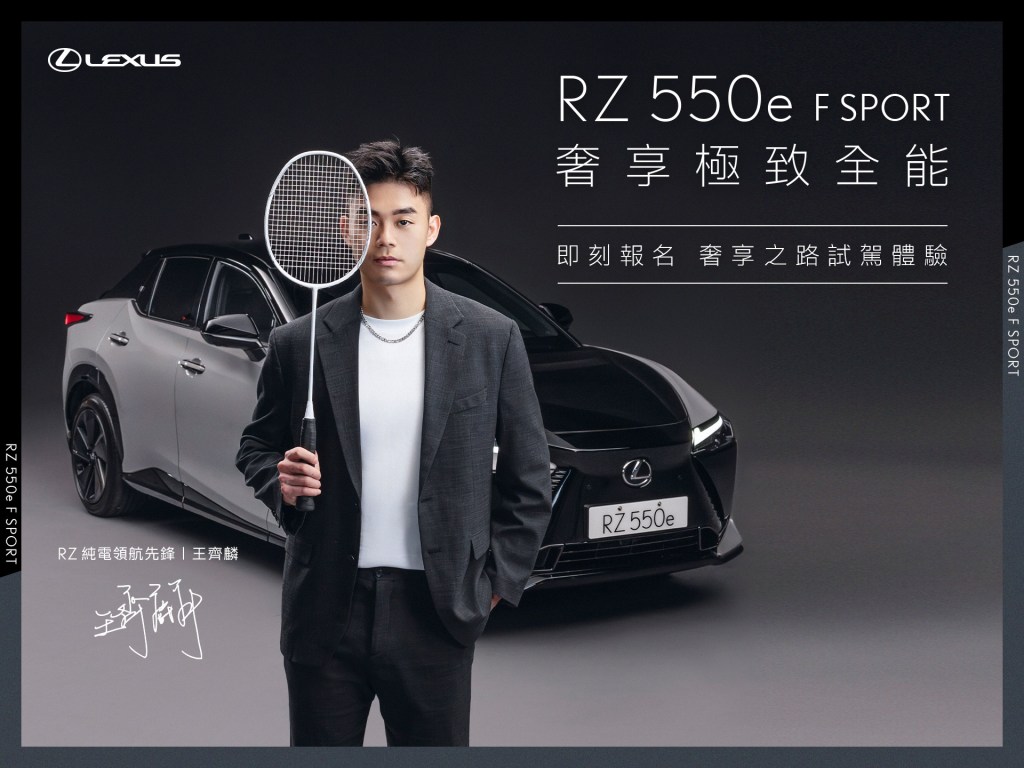 同時,Lexus也推出「Lexus RZ 550e F SPORT 奢享之路試駕體驗」活動,由「RZ純電領航員」王齊麟帶隊,邀請消費者入座試駕,一同見證Lexus 豪華電能美學的新篇章!即日起至 12 月 21 日止,填妥報名資訊,即有機會駕乘RZ 550e F SPORT,前往王齊麟推薦的私房景點,親身感受 RZ 550e F SPORT 的純電駕馭魅力並與王齊麟面對面交流;於活動指定貼文完成指定互動,還有機會獲得王齊麟親筆簽名羽毛球拍,詳細資訊請持續鎖定Lexus官方FB與IG粉絲團。