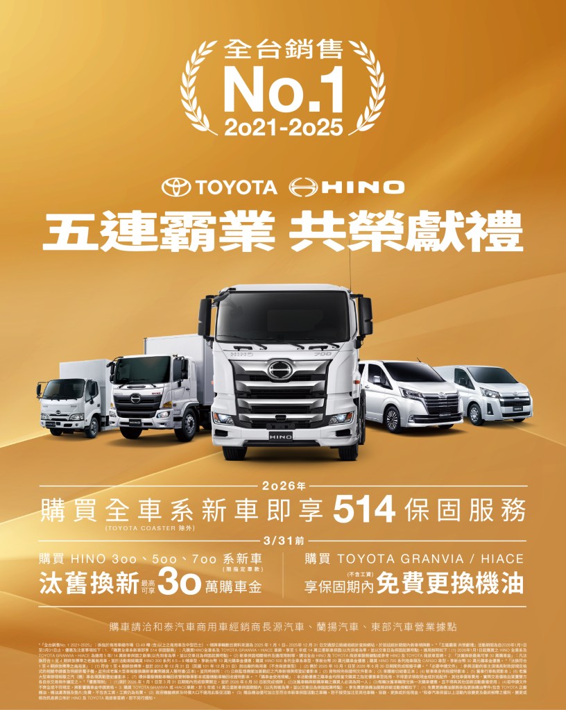 「五連霸業 共榮獻禮註2」於2026/1/1起購買HINO全車系及TOYOTA GRANVIA、HIACE車款,即享5年或14萬公里新車保固註3(以先到者為準),全面守護所有顧客。另於2026/1/1至3/31期間,凡汰換符合1至4期排放標準之老舊商用車,並購買HINO 300系6.5~8噸,享NT$10萬元購車金、購買HINO 500系全車系,享NT$20萬元購車金、購買HINO 700系拖車頭及CARGO車型,享NT$30萬元購車金回饋註2。