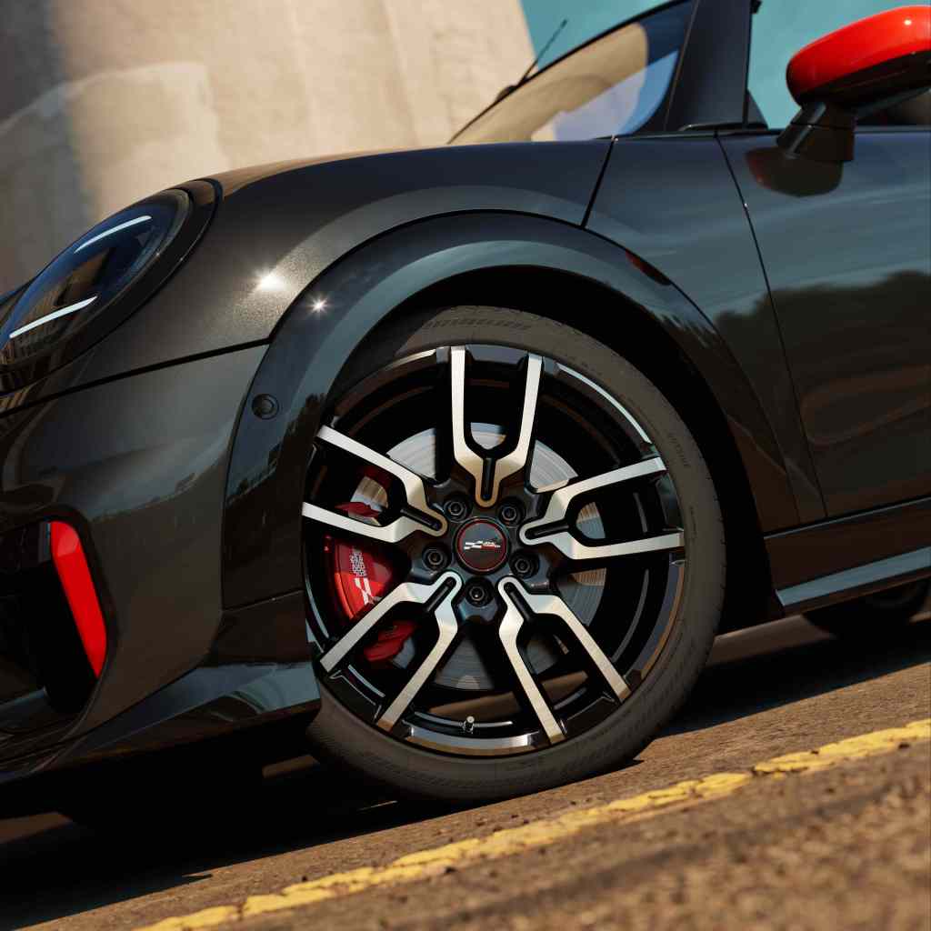 MINI John Cooper Works Cabrio配備電動軟篷,僅需18秒即可完全開啟,並可於時速30km/h以下行駛中從容操作。天窗模式下頂篷可以開啟40公分,讓駕駛者依照行車節奏與心情自由切換開篷狀態。專屬Always Open開篷計時功能更是MINI John Cooper Works Cabrio的標誌性特色, OLED圓形中控螢幕即時顯示累積開篷時間,將每一次迎風馳騁化為值得珍藏的駕馭時刻。MINI John Cooper Works Cabrio以鮮明的JCW視覺設計語彙,展現強烈性能氣勢:18吋JCW Lap Spoke雙色輪圈含跑車胎,搭配JCW專屬紅色運動化卡鉗,結合JCW黑色高光澤前後下護板、側裙與輪拱,強化視覺一致性,也呼應其性能取向的設計核心,營造濃厚賽車氛圍。經典圓形LED頭燈,提供三種個性化頭/尾燈光模式,並支援迎賓與離車燈光效果。展現純粹且俐落的品牌辨識度。