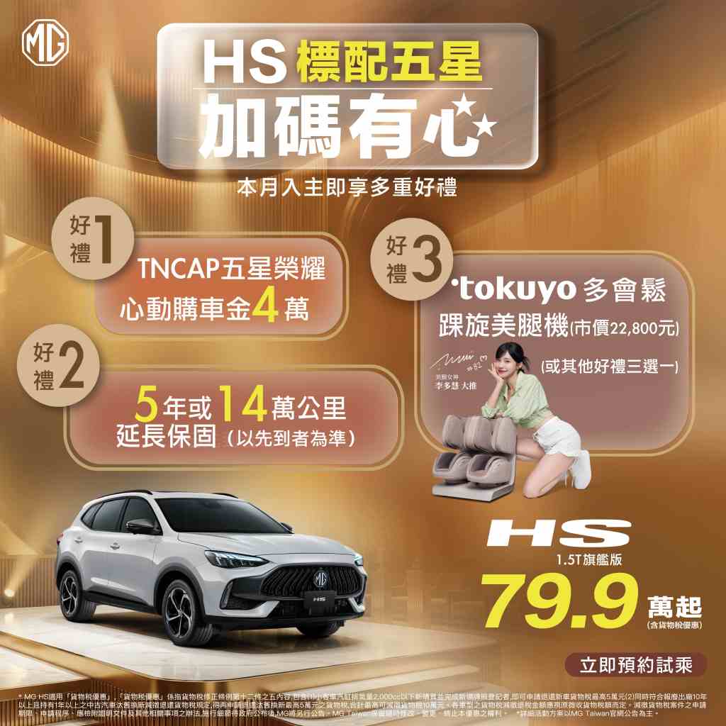 MG Taiwan在1月同步推出專屬購車優惠,全車系受惠於貨物稅新購減徵,HS車系搭配舊換新補助後最低79.9萬元起、ZS車系59.9萬元起、G50 PLUS 98.5萬元起,HS車型更提供五星榮耀心動購車金最高4萬元,本月完成領牌還可享有第五年延長保固(價值15,000元),為新年換車兼具安全與價值的最佳首選。