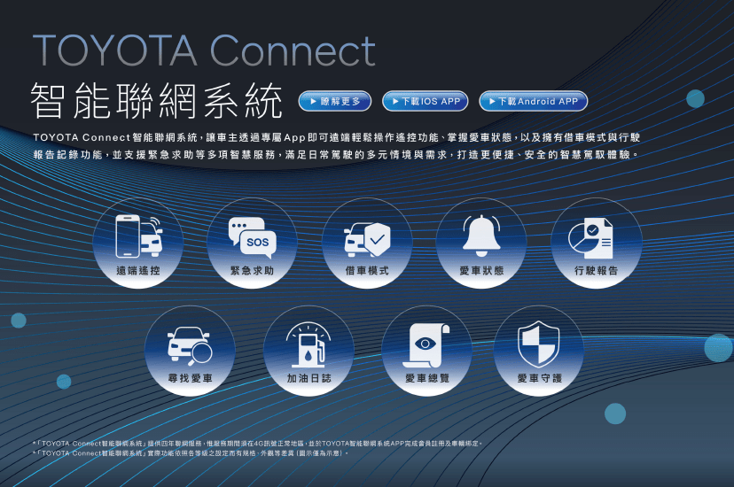 註4:「TOYOTA Connect智能聯網系統」部分功能需搭配4G連網後方能使用,實際功能依照各車型及等級之設定而有規格、外觀等差異。其作動皆有其限制條件,詳情請參閱使用手冊或官網相關QA說明。